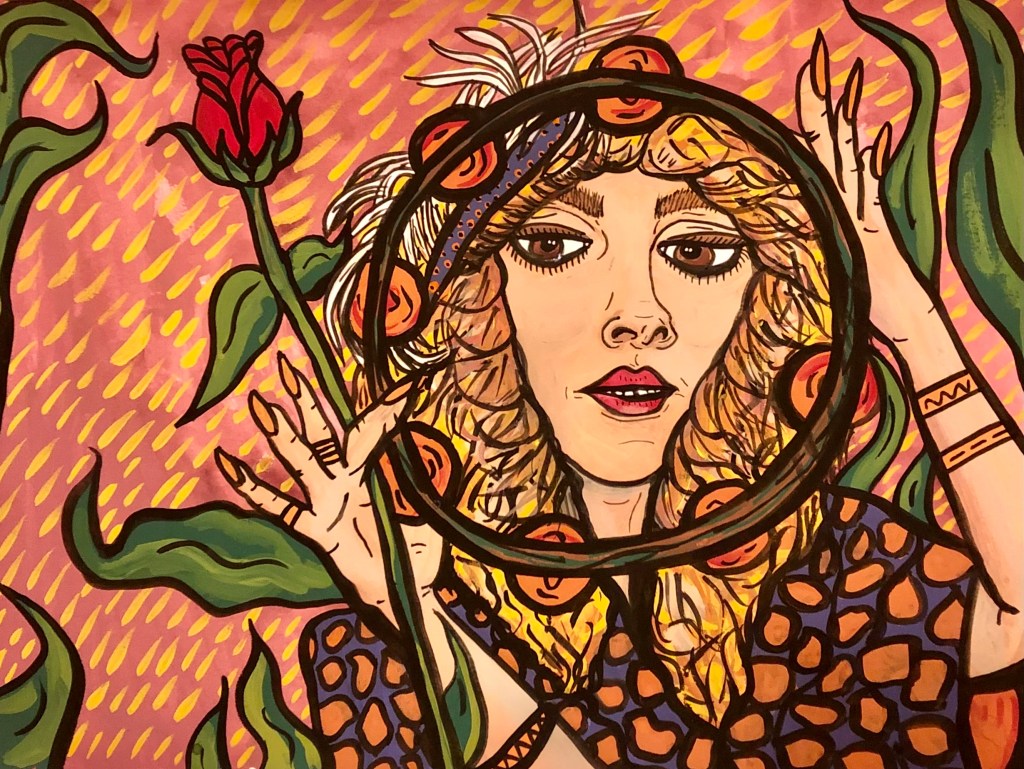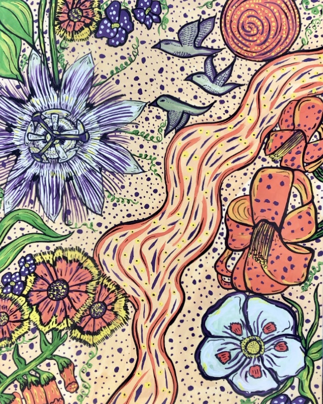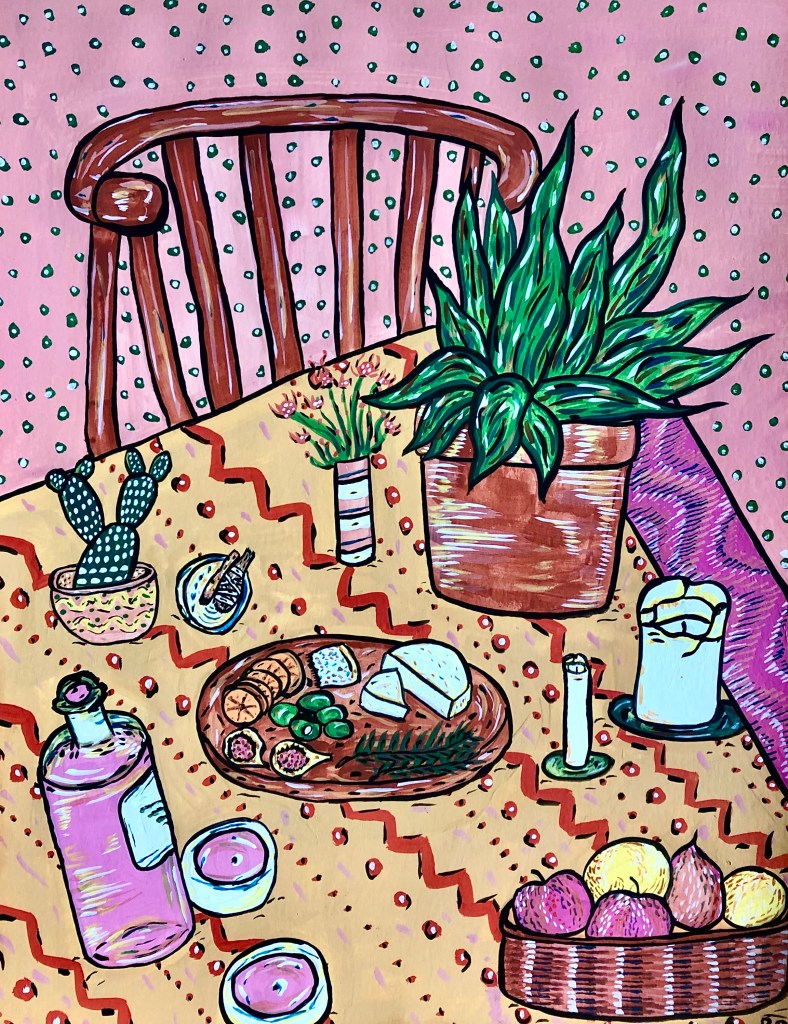She received her Bachelor of Arts degree from Whitman College, and has been an artist-in-residence at Sou’wester Lodge. Rachel’s current work delves into the dynamic interplay between traditional portraiture and vivid, maximalist color schemes. Inspired by daydreams and playful mischief, she creates richly saturated explorations of deeply personal narratives, and celebrates the creatures and talismans that bring joy and solace into daily life.